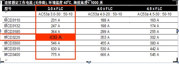 當起動電流倍數(shù)為3倍時,額定電機滿載電流430A,由此推算其額定輸出電流能力為: