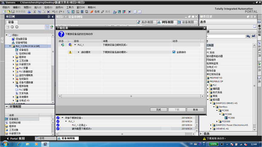 七、:配置丹佛斯變頻器(進(jìn)入‘網(wǎng)絡(luò)視圖’-打開右側(cè)‘硬件目錄’-選擇‘其他現(xiàn)場(chǎng) 設(shè)備’-‘PROFIBUS DP’-‘驅(qū)動(dòng)器’-‘DANFOSS DRIVESA/S’-‘DANFOSS’-‘FC300’-‘FC300’-‘FC300’),將其如圖七所示拖動(dòng)。