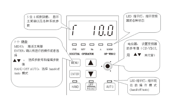 海利普變頻器的參數(shù)通過面板來進(jìn)行設(shè)置。面板和使用步驟如下圖: