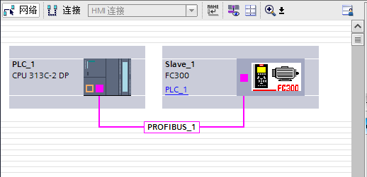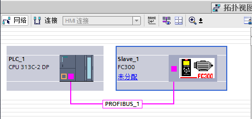 將變頻器 FC300 拖動(dòng)到 PROFIBUS_1 連接線處后,PLC 和變頻器連接在一起,F(xiàn)C300 顯 示為未分配。
