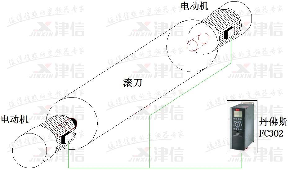 丹佛斯FC302變頻器通過(guò)磁通矢量控制同時(shí)驅(qū)動(dòng)兩臺(tái)異步伺服電機(jī),保證在飛剪同步的過(guò)程中滾刀兩電機(jī)輸出轉(zhuǎn)速和轉(zhuǎn)矩一致。在選型和調(diào)試時(shí)只要將電機(jī)的功率和電機(jī)的電流相加即可,這樣就可以只通過(guò)丹佛斯FC302變頻器來(lái)實(shí)現(xiàn)剛性連接的兩個(gè)電機(jī)同步。