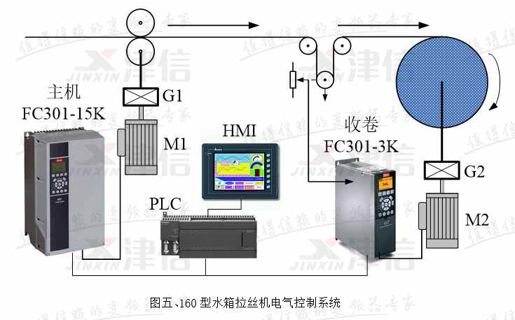 水箱拉絲機是子午線輪胎用鋼簾線生產企業(yè)的關鍵設備,其收卷控制是變頻器跳舞輪位置反饋控制。由于生產速度快,用量大,加上環(huán)境比較惡劣,因此要求采用性能優(yōu)異,穩(wěn)定性好,質量可靠和抗腐蝕能力強的變頻器。我廠為拉拔0.22毫米以下線徑的鋼簾線定制了160型新型水箱拉絲機上,全部選用了丹佛斯最新推出的FC系列變頻器作收卷和主傳動驅動,取得了很好的運行效果。