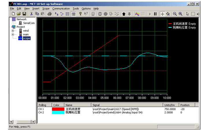 卷繞控制的特點:同樣的一套PID調節(jié)參數,勻速時易于穩(wěn)定,波動也較??;而加速時就不易于穩(wěn)定,而且因為跳舞輪位置有靜差,波動幅度也較大。因此PID調節(jié)參數主要針對加減速過程予以優(yōu)化。MCT軟件有數字示波器功能,通過實時觀測線速度和跳舞輪位置在加減速時的變化曲線,能很方便地調整調節(jié)參數。