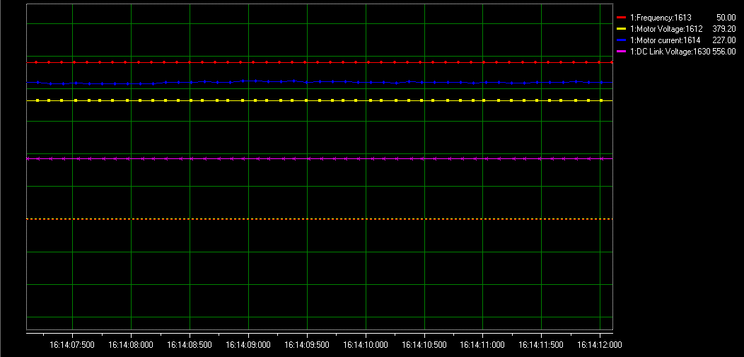 對(duì)以上參數(shù)進(jìn)行調(diào)整后,客戶描述的現(xiàn)象(電機(jī)的震動(dòng)和噪音)明顯得到解決,以下為變頻器經(jīng)過(guò)調(diào)整過(guò)后的電機(jī)波形和音頻文件