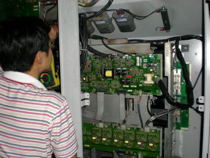首先打開頂部風(fēng)機(jī)蓋板,取出頂部4個(gè)散熱風(fēng)機(jī),露出散熱片,用空壓氣體清理散片。將散熱片清理干凈后,更換兩個(gè)損壞的風(fēng)機(jī) 同時(shí)將剩下的兩個(gè)散熱風(fēng)機(jī)也清理干凈。安裝好風(fēng)機(jī)后,蓋好風(fēng)機(jī)蓋板。將好的SOFTCHARGE CARD 、GATEDRIVE CARD安裝好,換上新的快速熔斷器和POWER CARD。最后將CONTROL CARD裝好。變頻器安裝完畢。再次檢查變頻器的各個(gè)部分器件好壞,檢查變頻器的外圍線路,確認(rèn)滿足變頻器送電條件。給變頻器送電,發(fā)現(xiàn)變頻器散熱風(fēng)機(jī)運(yùn)行正常,開機(jī)輸出電壓平衡,帶負(fù)載運(yùn)行正常。變頻器成功修復(fù)。