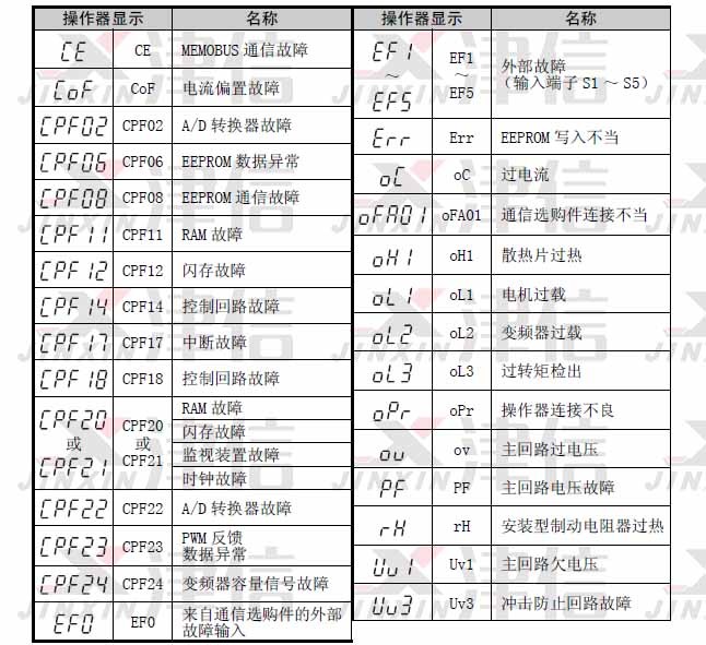 1、故障報(bào)警代碼CE,COF,ERR,CPF02,CPF06,CPF08,CPF11,CPF12,CPF14,CPF18,CPF20,CPF21,CPF22,CPF23,CPF24,EF0,EF,OC,OFA01,OH1,OL,UV1,UV3