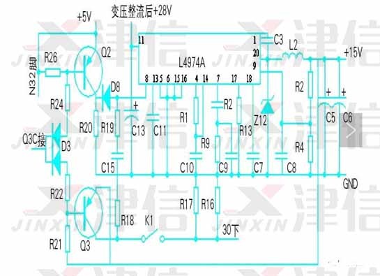 Ø 測試芯片L4974A 輸出電壓15V為0V,查芯片8腳軟啟動電壓是0.5V,正常值為3.85V,所以芯片L4974A的8腳輸入電壓不對。經(jīng)查Q2輸入觸發(fā)電壓正常。