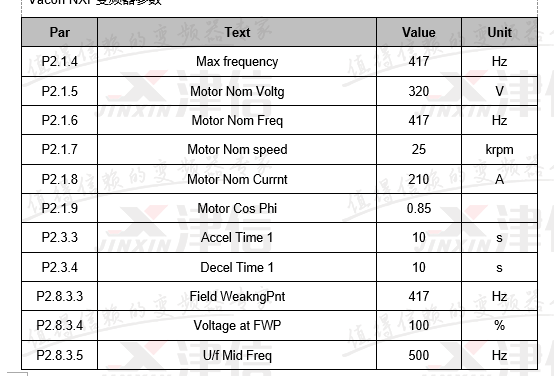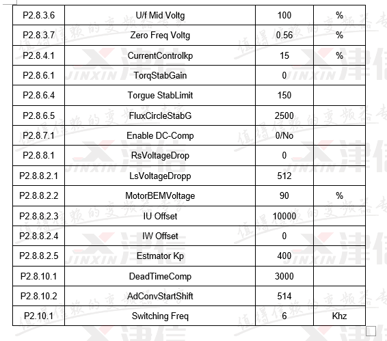 4) 設(shè)定變頻器的P2.1.5到P2.1.11的電機(jī)參數(shù)。