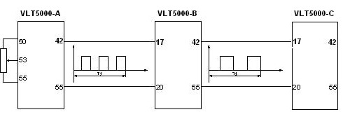 系統(tǒng)由5臺VLT5000系列變頻器及輔助的開關、指示燈、電位器及必要的空開等電氣器件組成。圖-1中A變頻器的速度作為主速給定(它自身的速度由外部電位器給定), A變頻器的42號端子對應自身輸出轉(zhuǎn)速,自動的轉(zhuǎn)化為脈沖信號(頻率)輸出給B變頻器,作為B變頻器的速度給定信號(通過B變頻器的29號端子來接收脈沖信號),然后再由B變頻器通過修改內(nèi)部參數(shù)327號,經(jīng)過計算后相應的輸出一定的轉(zhuǎn)速。同理B變頻器對應自身輸出轉(zhuǎn)速自動的轉(zhuǎn)化為脈沖信號(頻率)通過42號端子輸出脈沖信號(頻率)作為C變頻器的速度給定信號(通過C變頻器的29號端子來接收脈沖信號),以此類推,一直到E變頻器。在此過程中,所有速度給定信號都是數(shù)字式的(既速度信號通過給定的脈沖頻率的變化,結(jié)合自身內(nèi)部的計算實現(xiàn)不同的轉(zhuǎn)速)。