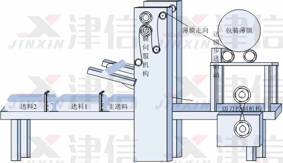 枕式包裝機(jī)主體基本上有送料部分、送膜部分和裁切部分構(gòu)成,如圖1所示。所有的動作邏輯及相位控制均以主送料軸的主軸編碼器信號為參考進(jìn)行控制。本文將就臺達(dá)A2伺服內(nèi)置電子凸輪功能的應(yīng)用加以闡述。其內(nèi)置電子凸輪功能,具有低成本和高靈活性的優(yōu)勢。