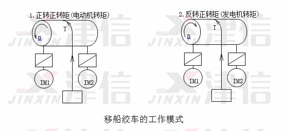 移船絞車是重要的海工設(shè)備,在海上工作平臺、鋪管船里有廣泛的應(yīng)用。移船絞車的工況與起升相似,正轉(zhuǎn)時收線,變頻器工作于電動機(jī)模式,電機(jī)對負(fù)載作功;反轉(zhuǎn)時放線,變頻器工作于發(fā)電機(jī)機(jī)模式,負(fù)載對電機(jī)做功,要求變頻器內(nèi)置制動晶體管。與普通起升不同的是,移船絞車連續(xù)工作時間很長(數(shù)小時),所以對于變頻器的過載能力要求不高,但是要求變頻器具有100%制動轉(zhuǎn)矩連續(xù)運(yùn)行的能力。