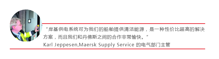 2017年初,Maersk Supply Service公司的電氣部門主管Karl Jeppesen針對(duì)公司管理提出了一個(gè)商業(yè)案例,即使用岸電為船舶供電,預(yù)計(jì)在6個(gè)月內(nèi)實(shí)現(xiàn)投資回報(bào)。很快,公司就通過(guò)了這個(gè)岸電項(xiàng)目,而且到2017年10月時(shí)整套系統(tǒng)就已完全投入運(yùn)行。
