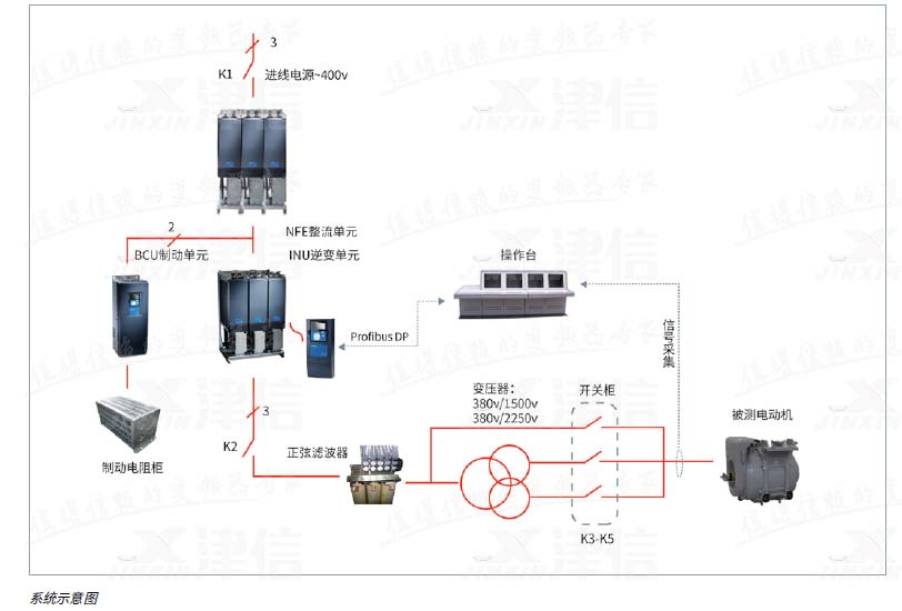 這個項目是Danfoss公司首次同天作電氣的合作項目;項目中采 用了以丹佛斯公司VACON® NX系列變頻器為電源核心的測試電源解決方案。單元+逆變單元+制動單元)、正弦濾波器、升壓變壓器、制動電阻以及輸出電壓切換開關(guān)構(gòu)成??梢蕴峁┳罡咧?250V的正弦電壓輸出。天作電氣成柜。另外包含測試操作臺,以及為了滿足測試工藝而選用的各種傳感器,功率分析儀器等。