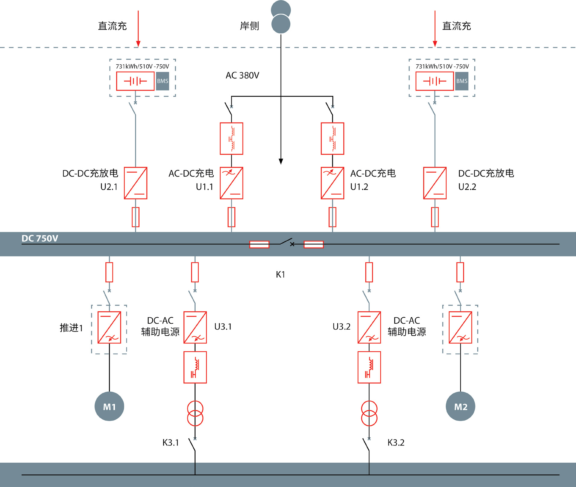 該船由中國最大的軌道交通電機(jī)電器生產(chǎn)企業(yè)-中國中車永濟(jì)電機(jī)有限公司整體研發(fā)制造,長江船舶設(shè)計院進(jìn)行整船設(shè)計,整船在武昌船舶重工集團(tuán)武昌基地制造并在各設(shè)備供應(yīng)商配合下進(jìn)行制造、調(diào)試和試航。由于該船設(shè)計立項為國內(nèi)第一艘新能源純電動船,因此對整個系統(tǒng)的挑戰(zhàn)非常大,沒有任何可借鑒的經(jīng)驗,因此對整船動力系統(tǒng)、舵槳系統(tǒng)、推進(jìn)系統(tǒng)、配電系統(tǒng)、輔助系統(tǒng)及網(wǎng)絡(luò)通訊系統(tǒng)提出了非常高的要求;最值得一提是該項目中使用的是新型直流配電系統(tǒng),更具有電能調(diào)節(jié)方便、節(jié)能提效、模塊化、智能化特點,諸多優(yōu)勢使其成為船舶領(lǐng)域的新興技術(shù);但相比于傳統(tǒng)的交流配電系統(tǒng)對該種配電方式也面臨諸多技術(shù)瓶頸。因此對變頻電源等核心元器件帶來巨大的挑戰(zhàn),丹佛斯傳動憑借產(chǎn)品的優(yōu)越的性能及穩(wěn)定的質(zhì)量打動了制造商及使用者,對動力系統(tǒng)、推進(jìn)系統(tǒng)、配電系統(tǒng)及輔助系統(tǒng)進(jìn)行了強(qiáng)有力的支持。