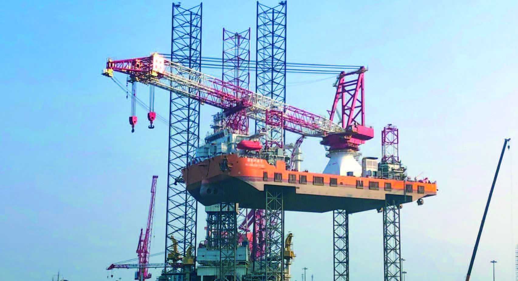 “海龍興業(yè)”號風(fēng)電安裝平臺是目前國內(nèi)最新型高端風(fēng)電安裝平臺,是我國第一座采用桁架式齒輪齒條升降設(shè)計的平臺,可用于7兆瓦及以下海上風(fēng)機的安裝作業(yè)。