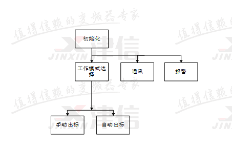 開機(jī)后,首先進(jìn)行程序的初始化。初始化完成后同時(shí)調(diào)用工作模式選擇、報(bào)警和PLC與變頻器之間的通訊程序。工作模式中,包含手動(dòng)出標(biāo)、自動(dòng)出標(biāo)兩種狀態(tài)。報(bào)警程序用于對(duì)機(jī)器狀態(tài)進(jìn)行實(shí)時(shí)監(jiān)控,并根據(jù)故障情況執(zhí)行相關(guān)動(dòng)作。