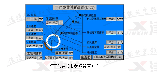 石英切割機(jī)有三個(gè)控制部分構(gòu)成:切刀旋轉(zhuǎn)控制、切刀位置控制和送料位置控制。切刀旋轉(zhuǎn)控制只要速度可調(diào)即可;切刀位置控制需要在切割石英管或石英棒的過程中控制其位置和不同段內(nèi)的速度,首先要保證切割產(chǎn)品的刀口質(zhì)量,同時(shí)要提高生產(chǎn)效率;送料位置控制需要每次往前送設(shè)定長(zhǎng)度的石英管或石英棒,精度要求0.2毫米。